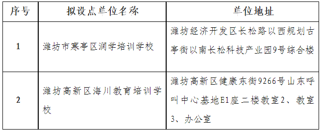 根据《山东省教育厅关于做好2025年度高等学历继续教育专业和校外教学点设置与管理工作的通知》(鲁教民函〔2025〕2号)、《山东省教育厅关于印发山东省高等学历继续教育校外教学点设置管理办法的通知》(鲁教民发〔2022〕1号)等文件要求,经设点单位申请、学校专家组现场考察评审,潍坊市寒亭区润学培训学校、潍坊高新区海川教育培训学校2家单位为山东海事职业学院高等学历继续教育拟设校外教学点,现予公示。公示期间,如对上述设点单位有异议,请以书面形式向山东海事职业学院继续教育学院提出。